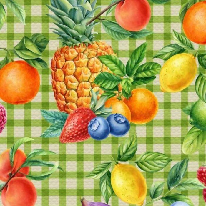 Descrição Tecido Tricoline Digital Mix Frutas Fundo Xadrez
