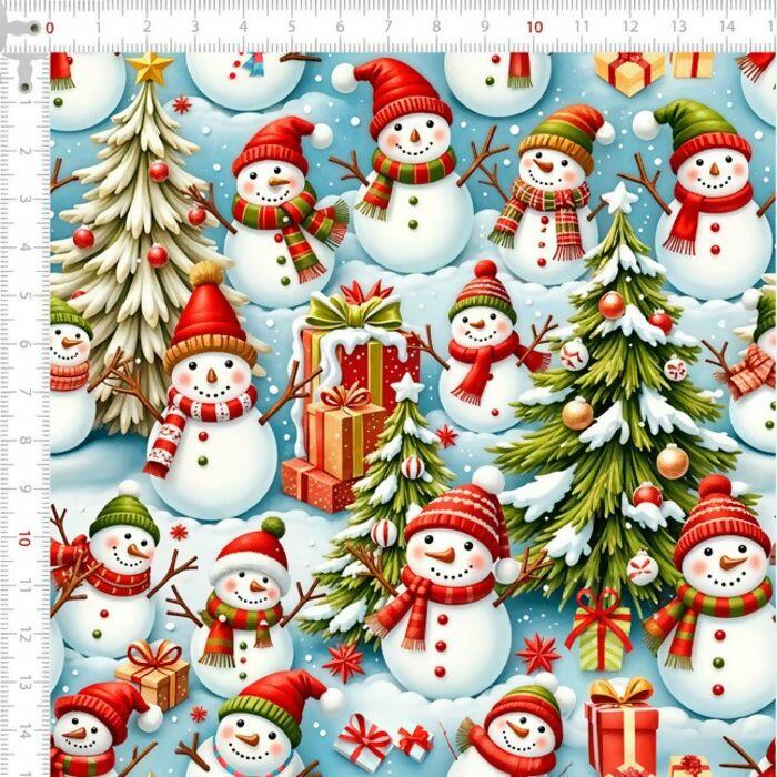 Descrição Tecido Tricoline Digital Natal Boneco de Neve Presentes