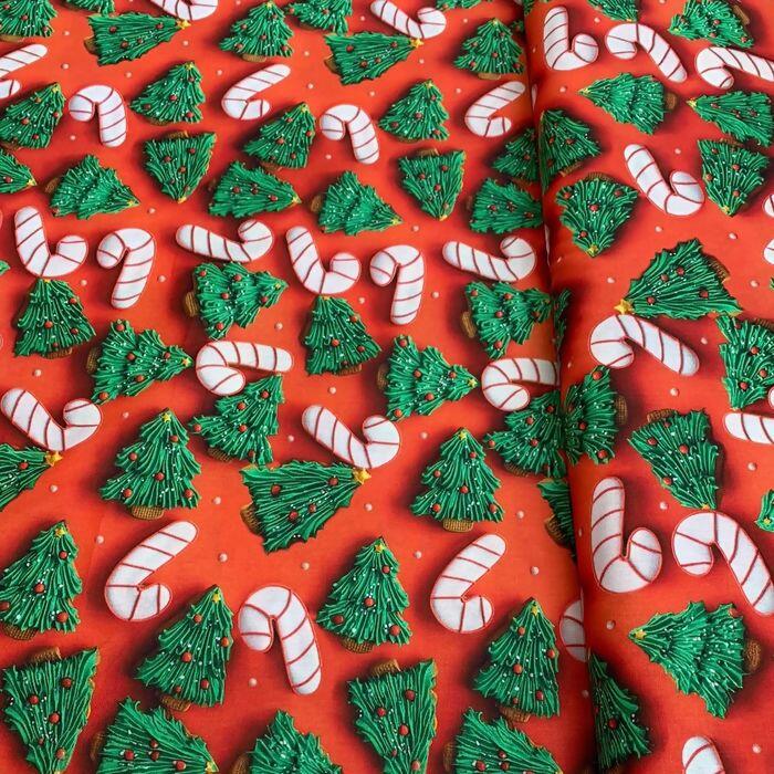 Tecido Tricoline Digital Natal Doces e Árvores Fundo Vermelho