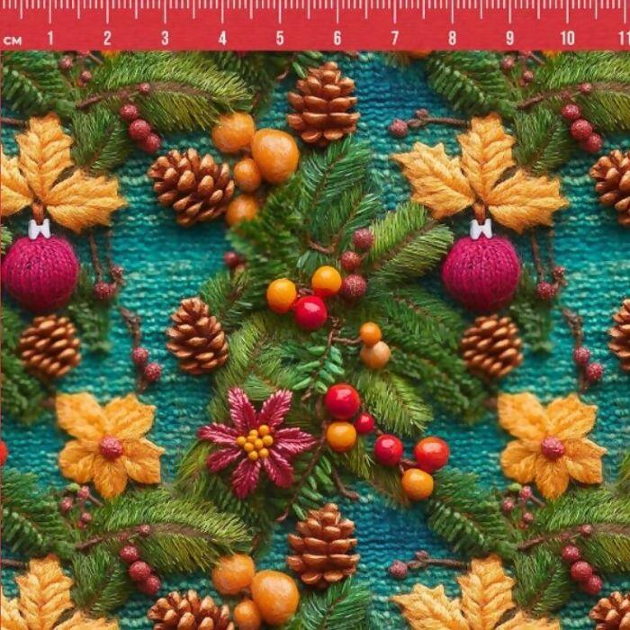 Descrição Tecido Tricoline Digital Natal Folhas e Pinhas