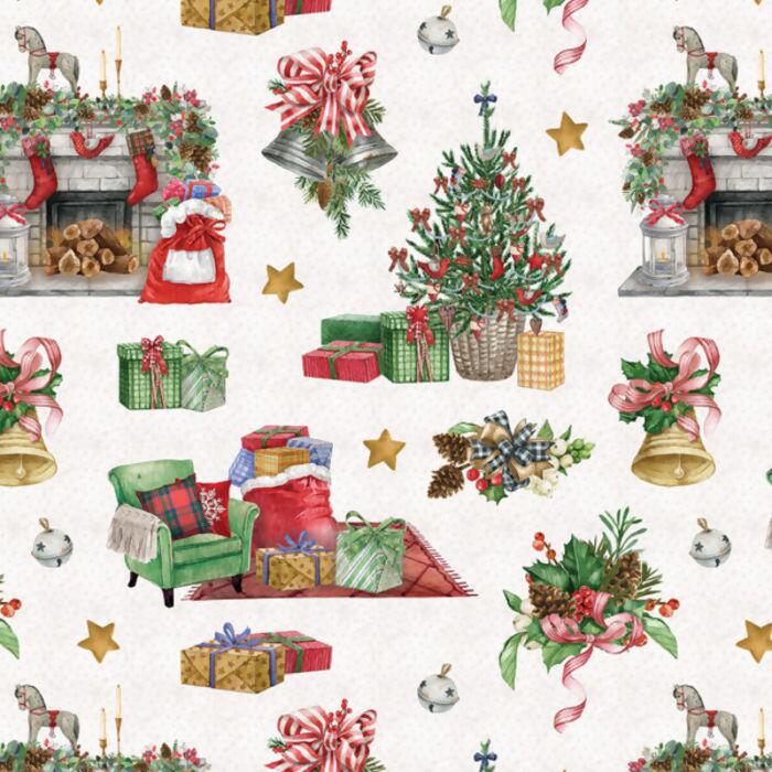 Tecido Tricoline Digital Natal Lareira Pinheiro e Presentes