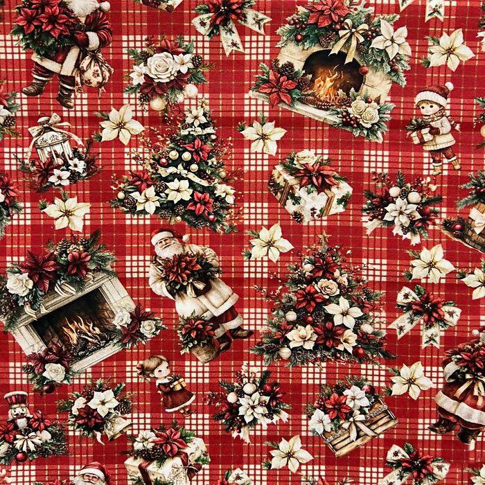 Tecido Tricoline Digital Natal Papai Noel Fundo Xadrez