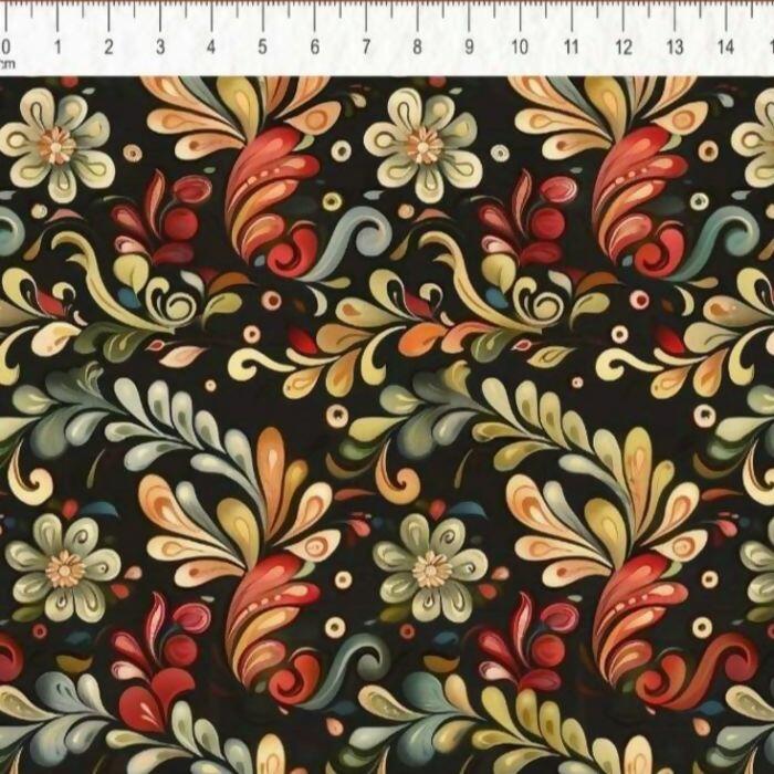 Tecido Tricoline Digital Noir Arabescos Fundo Preto