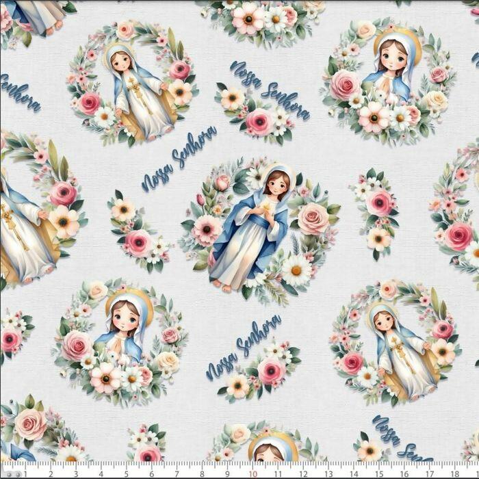 Descrição Tecido Tricoline Digital Nossa Senhora Fundo Cinza