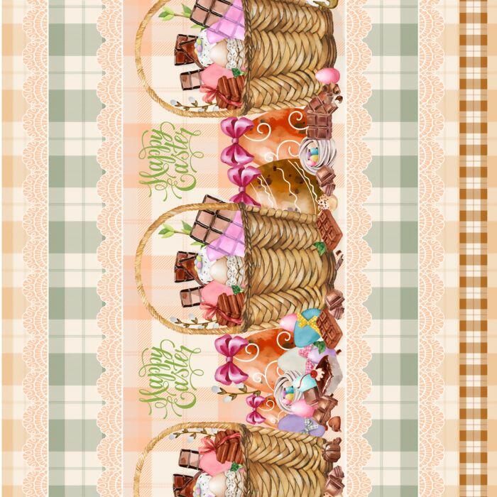 Descrição Tecido Tricoline Digital Páscoa Barrado Páscoa Cesta Chocolate