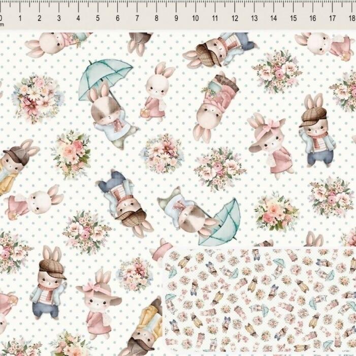 Tecido Tricoline Digital Páscoa Bouquet e Coelhos
