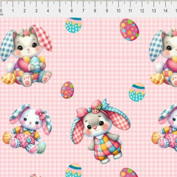 Descrição Tecido Tricoline Digital Páscoa Coelha Fundo Xadrez Rosa