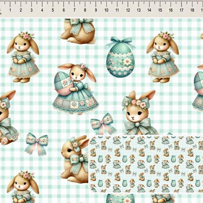Descrição Tecido Tricoline Digital Páscoa Coelhas Xadrez