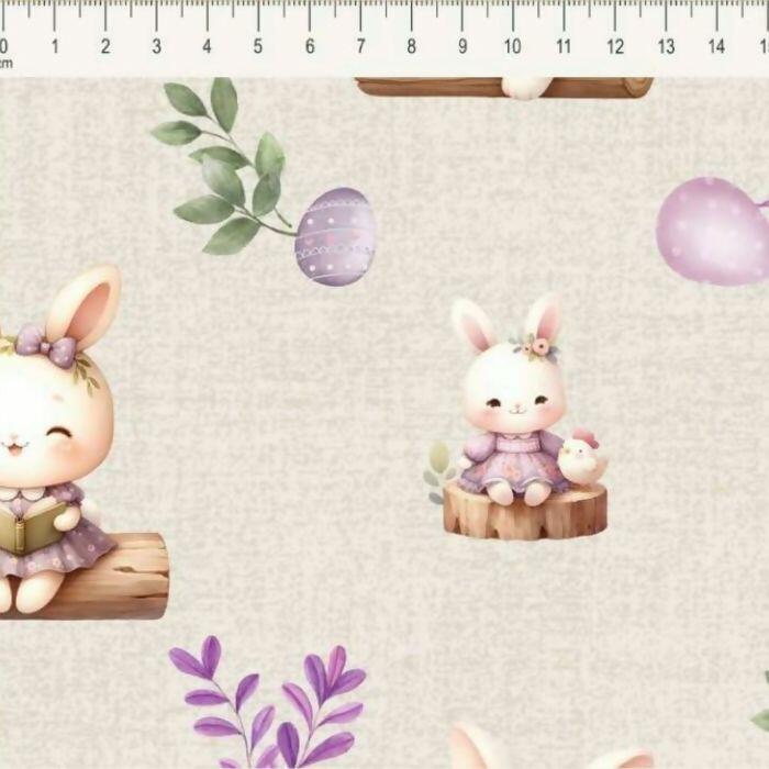 Descrição Tecido Tricoline Digital Páscoa Coelhinhas Fundo Bege