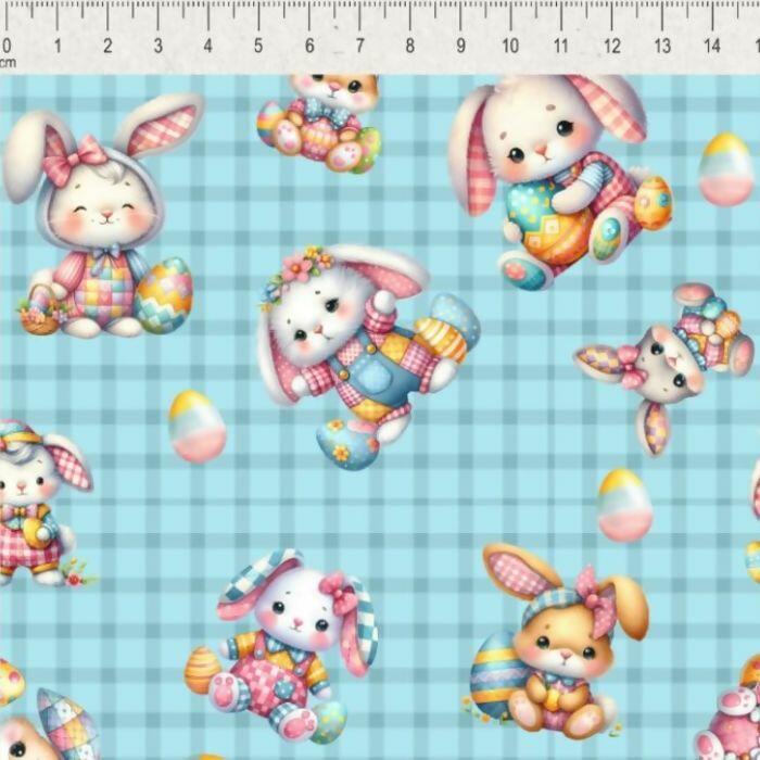 Tecido Tricoline Digital Páscoa Coelhos Coloridos Fundo Xadrez Azul
