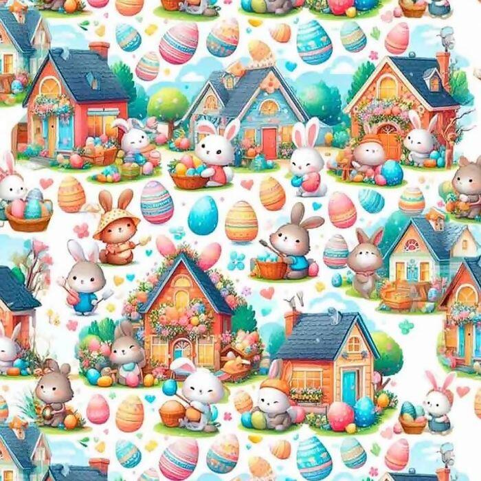 Descrição Tecido Tricoline Digital Páscoa Coelhos e Casinhas