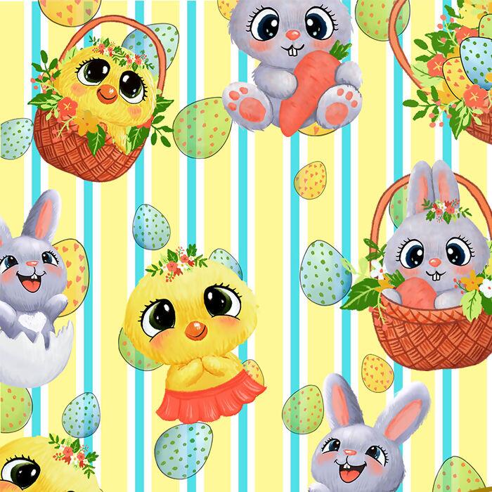 Descrição Tecido Tricoline Digital Páscoa Coelhos e Ovos Fundo Listrado Amarelo