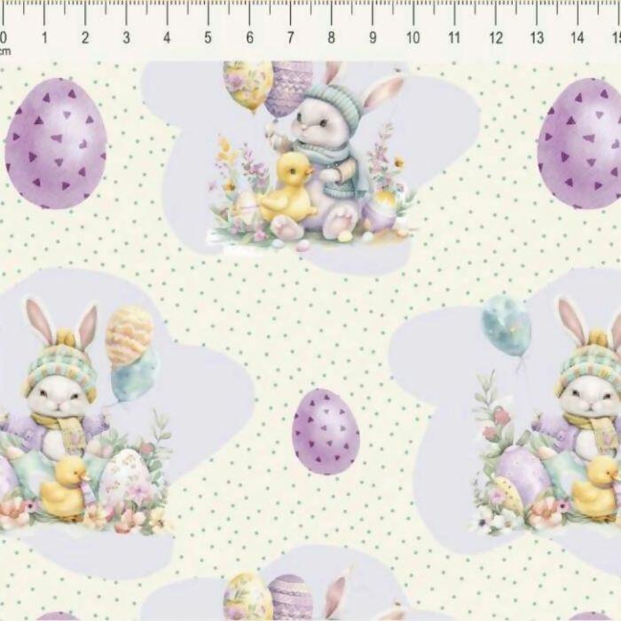 Tecido Tricoline Digital Páscoa Coelhos e Ovos Poá Verde