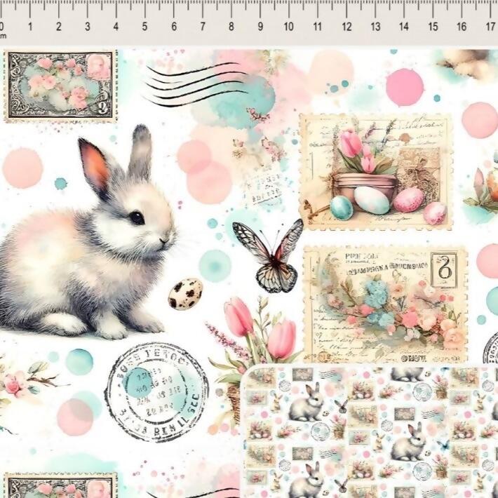 Descrição Tecido Tricoline Digital Páscoa Coelhos e Selos