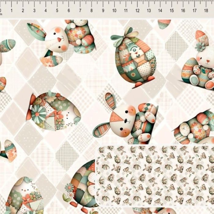 Descrição Tecido Tricoline Digital Páscoa Coelhos Ovos Fundo Bege