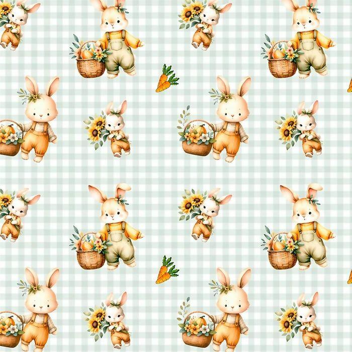 Descrição Tecido Tricoline Digital Páscoa Coelhos Xadrez Verde