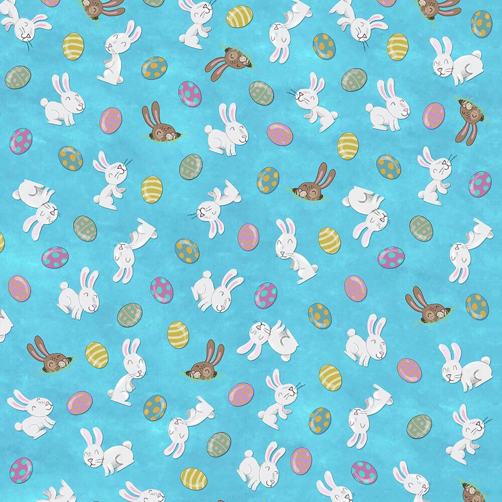 Tecido Tricoline Digital Páscoa Com Amigos Verdadeiros Coelhos e Ovos Fundo Azul