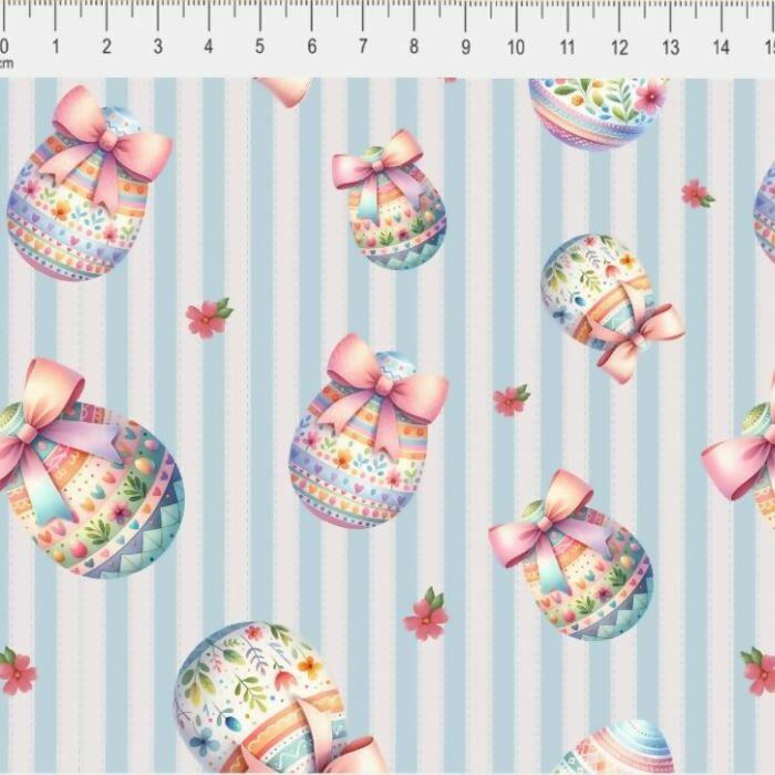 Tecido Tricoline Digital Páscoa Ovos Com Laços Fundo Listrado Azul