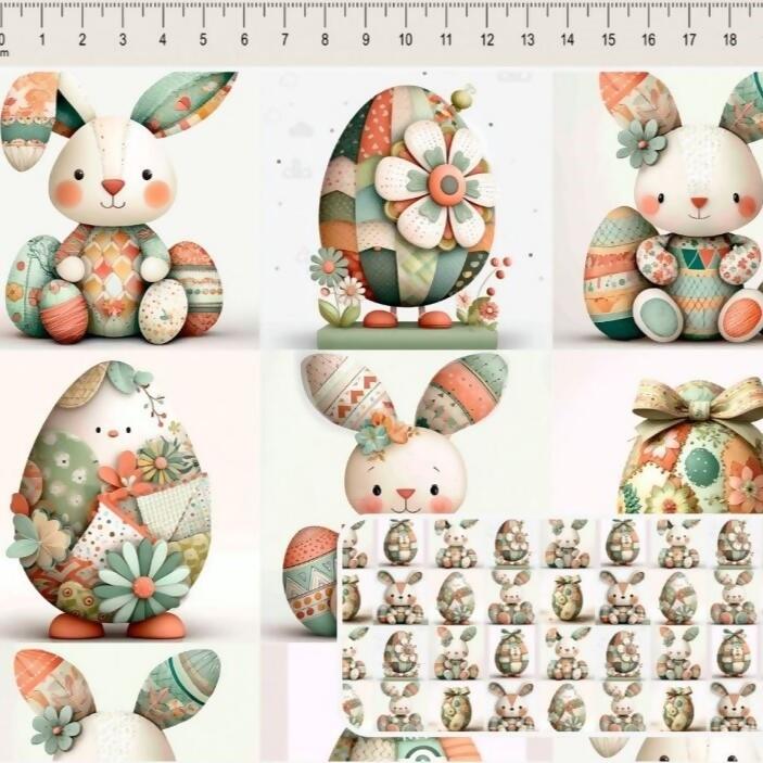 Descrição Tecido Tricoline Digital Páscoa Quadros Coelhos e Ovos