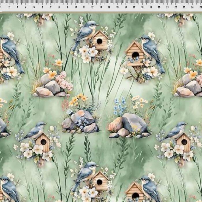 Descrição Tecido Tricoline Digital Pássaros e Pedras Fundo Verde