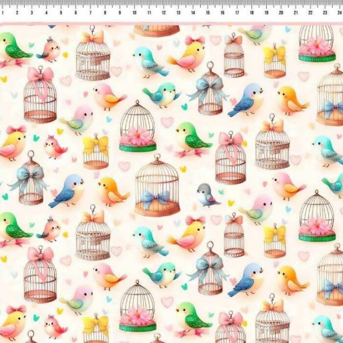 Descrição Tecido Tricoline Digital Pássaros Gaiolas