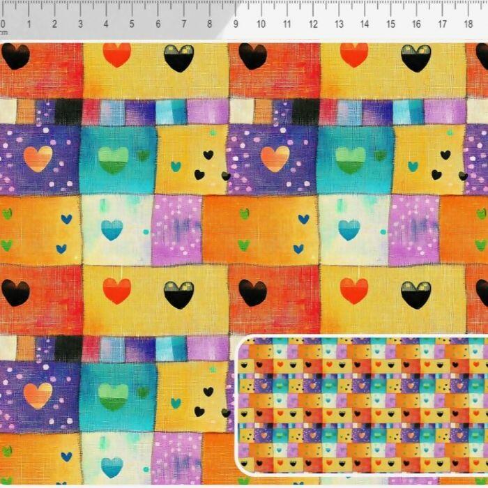 Tecido Tricoline Digital Patchwork Colorido Coração