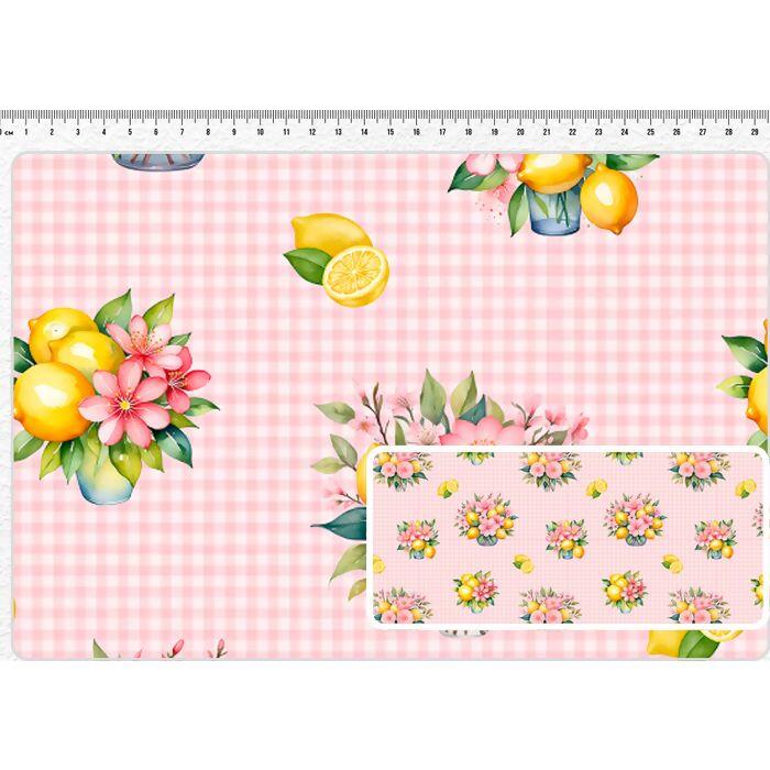 Descrição Tecido Tricoline Digital Pink Lemonade Limão e Flores Xadrez