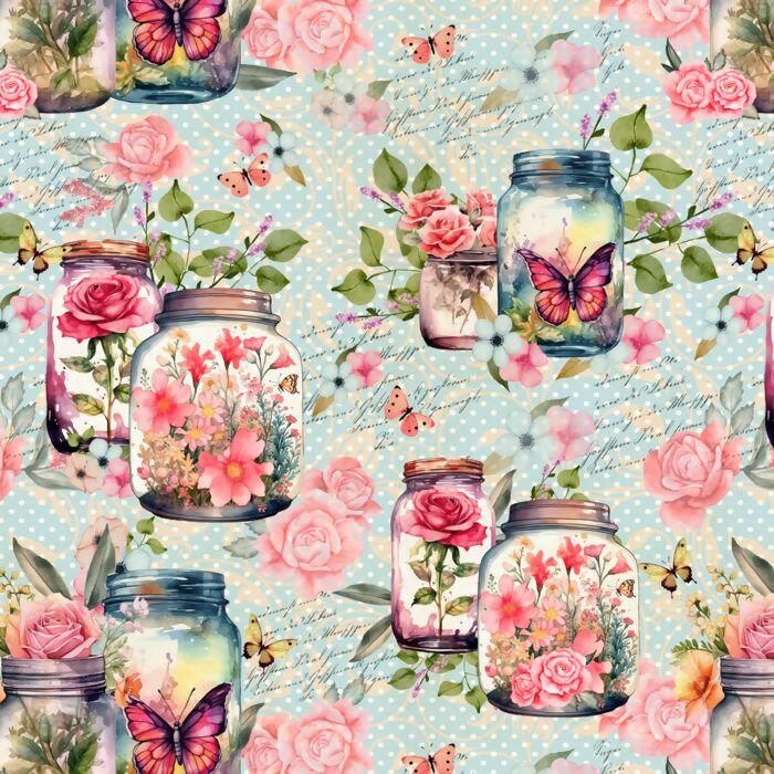 Descrição Tecido Tricoline Digital Pote Borboleta Fundo Poá Branco Verde
