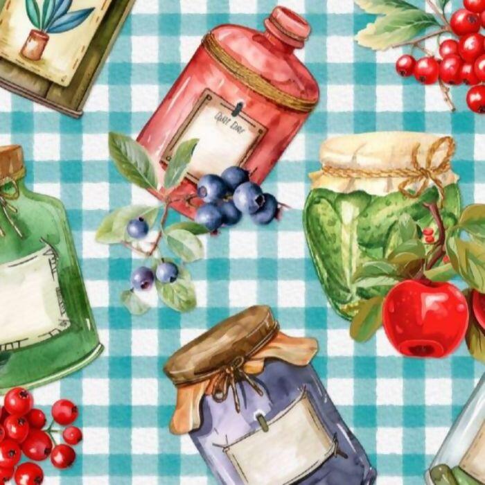 Descrição Tecido Tricoline Digital Potes Fundo Xadrez