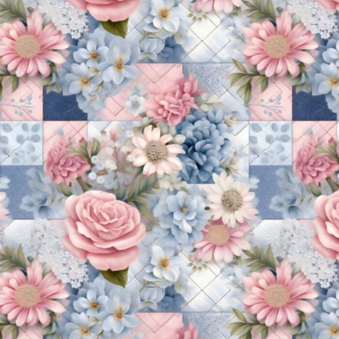 Descrição Tecido Tricoline Digital Romance Floral Patchwork Azul