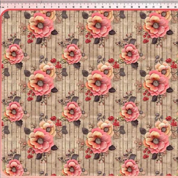 Descrição Tecido Tricoline Digital Rosas Fundo Marrom Listrado