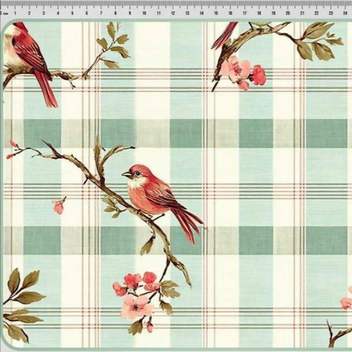 Tecido Tricoline Digital Sarja Pássaro Xadrez Grande