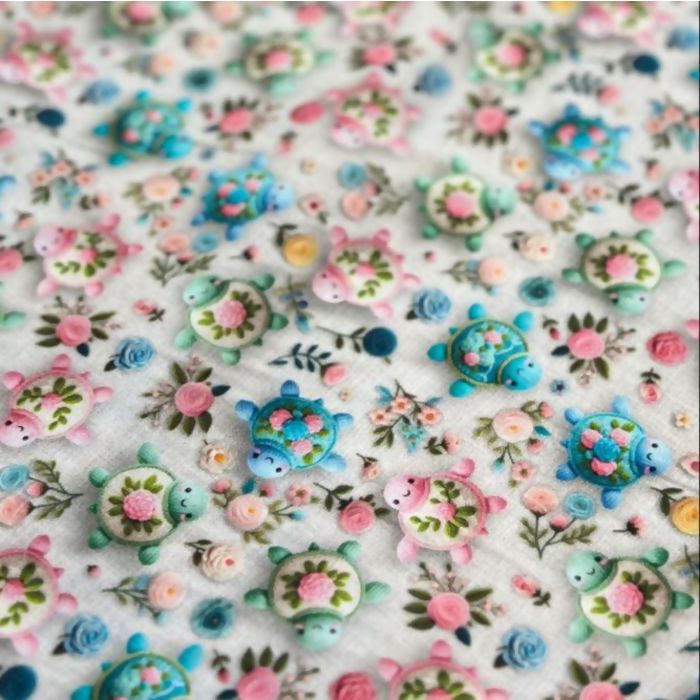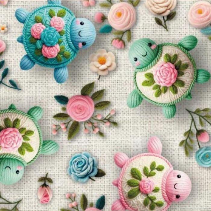 Descrição Tecido Tricoline Digital Tartarugas e Flores Crochê