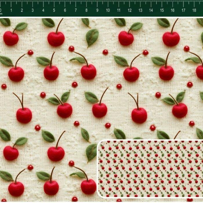 Descrição Tecido Tricoline Digital Tricô Cereja Fundo Bege