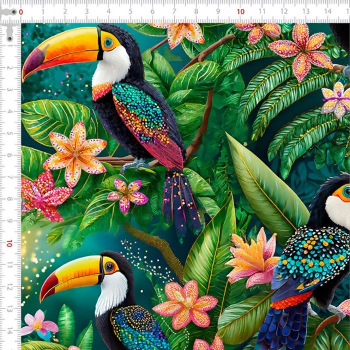 Descrição Tecido Tricoline Digital Tucanos Fundo Folhagem