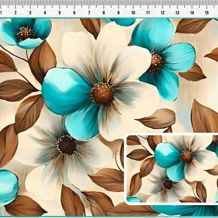 Descrição Tecido Tricoline Digital Turquesa Floral Grande