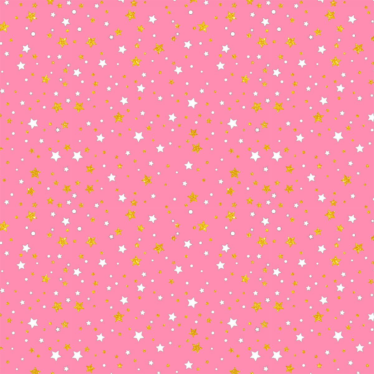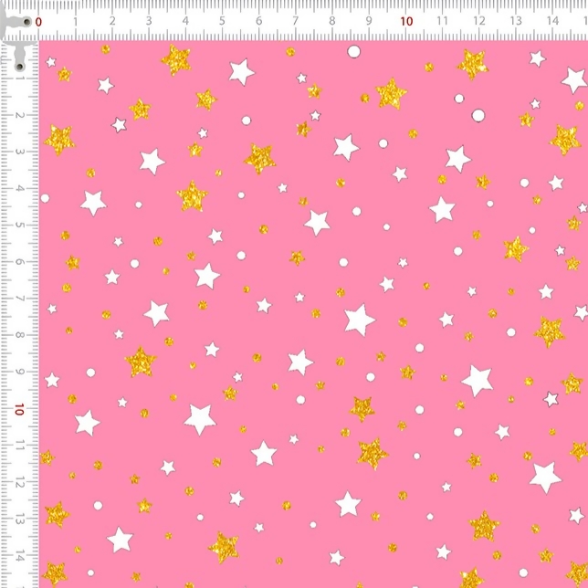 Descrição Tecido Tricoline Estrelas Brancas e Douradas Fundo Rosa