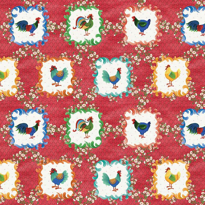 Descrição Tecido Tricoline Festa na Fazenda Arabescos Galos Fundo Vermelho