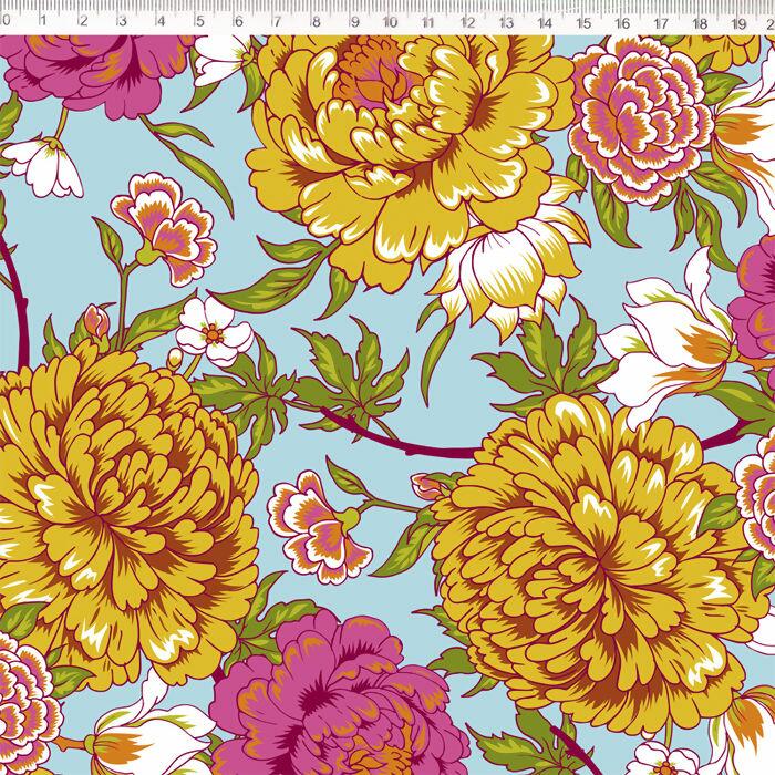 Descrição Tecido Tricoline Floral Crisântemo Fundo Azul Claro