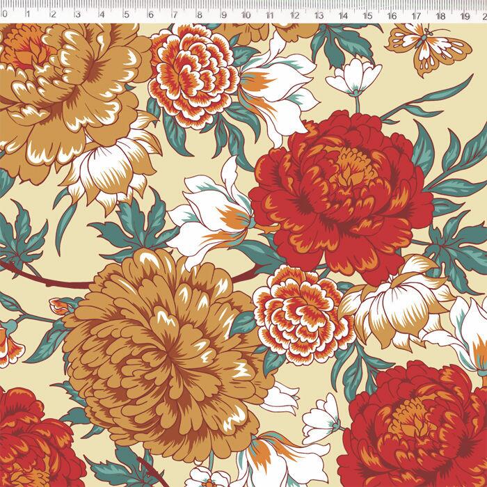 Descrição Tecido Tricoline Floral Crisântemo Fundo Bege