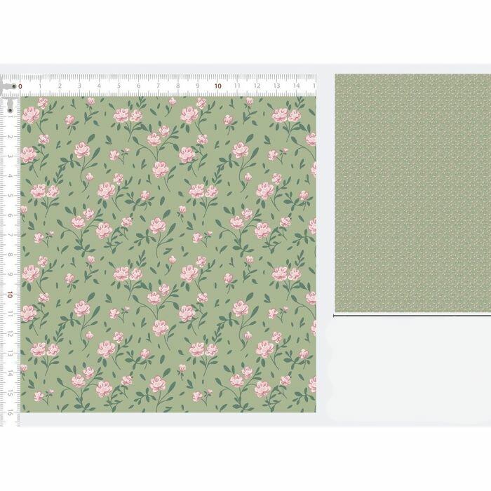 Descrição Tecido Tricoline Floral Rosa Fundo Verde Claro