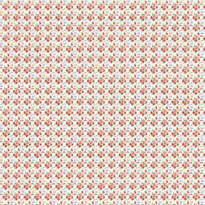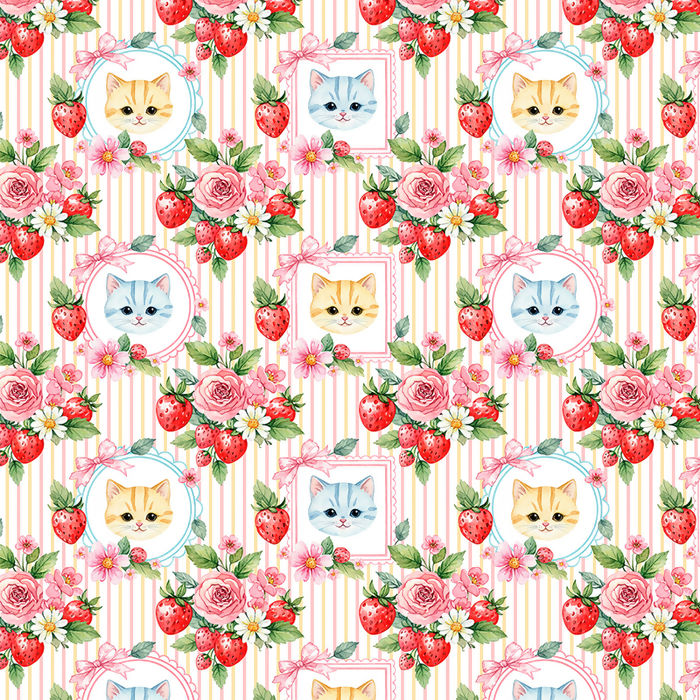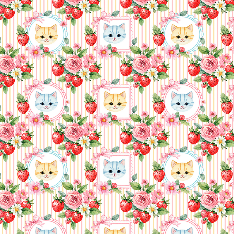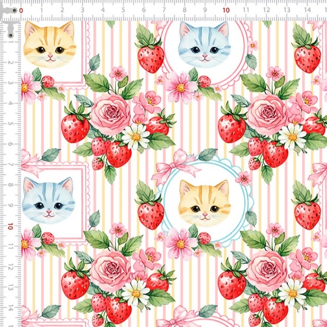 Descrição Tecido Tricoline Gatos e Morangos Fundo Listrado