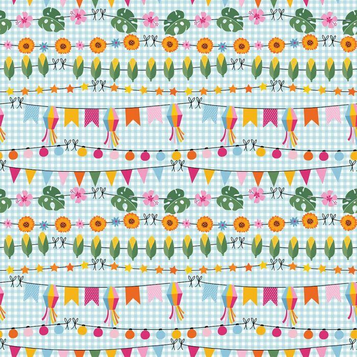Tecido Tricoline Junino Bandeirinhas Flores e Milho Xadrez