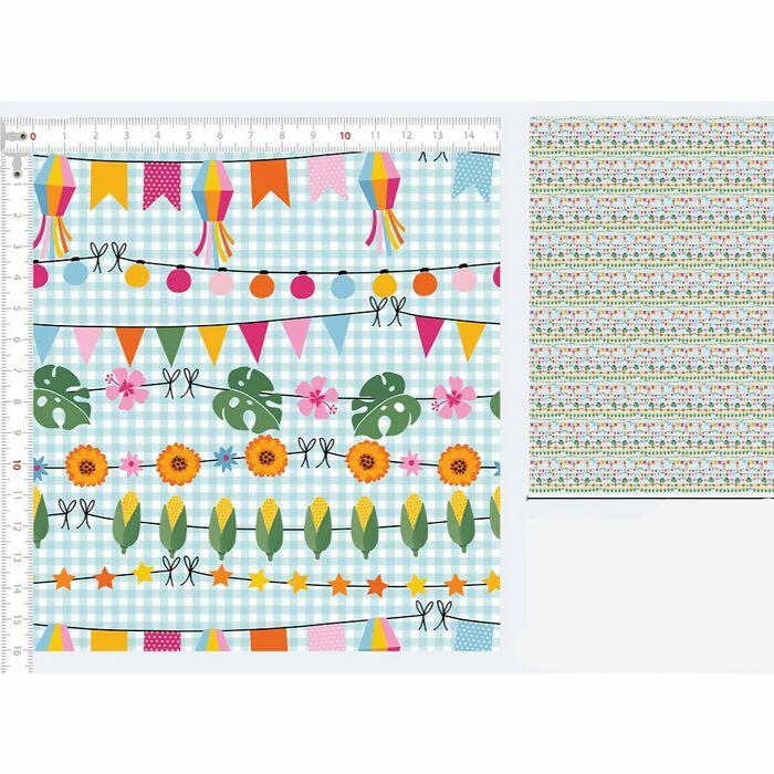 Descrição Tecido Tricoline Junino Bandeirinhas Flores e Milho Xadrez