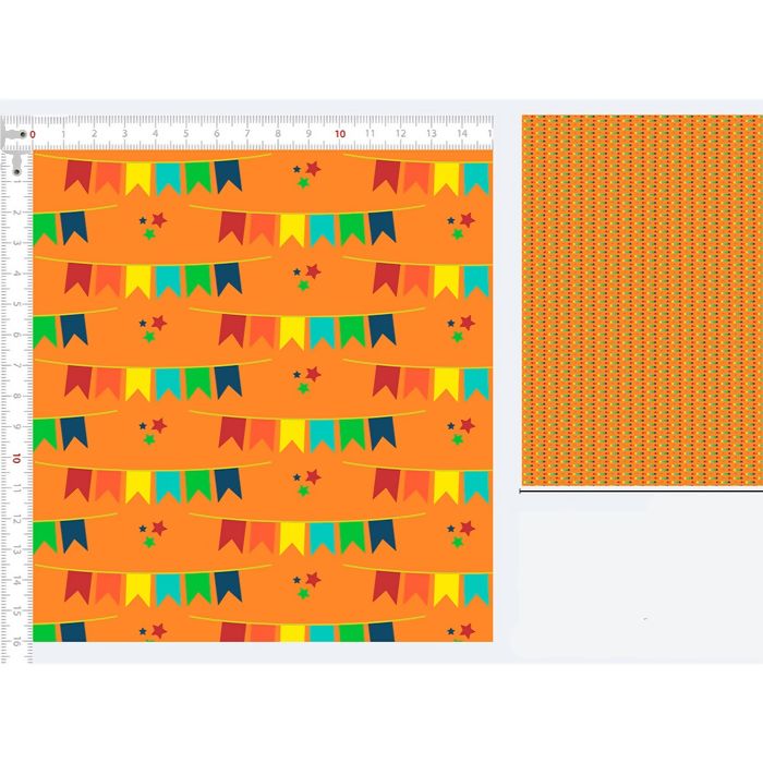 Descrição Tecido Tricoline Junino Bandeirinhas Fundo Laranja