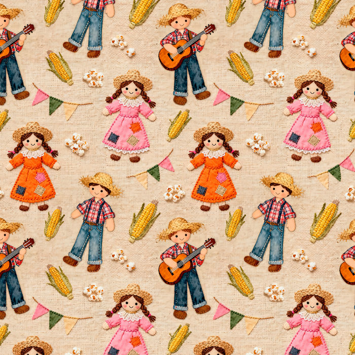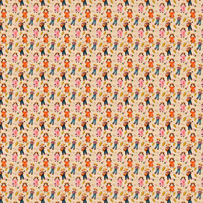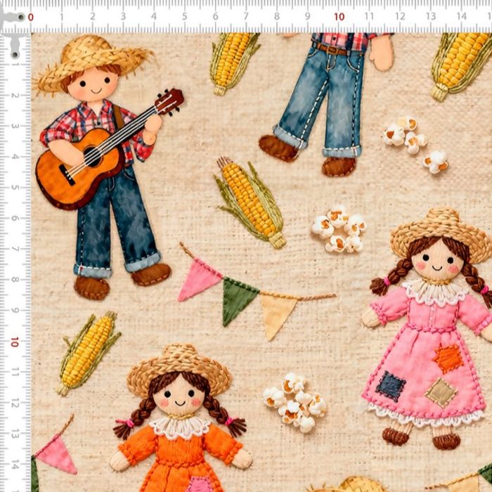 Descrição Tecido Tricoline Junino Bonecos Caipiras Fundo Bege