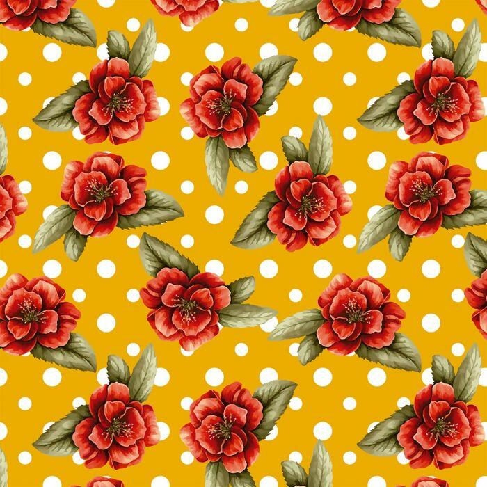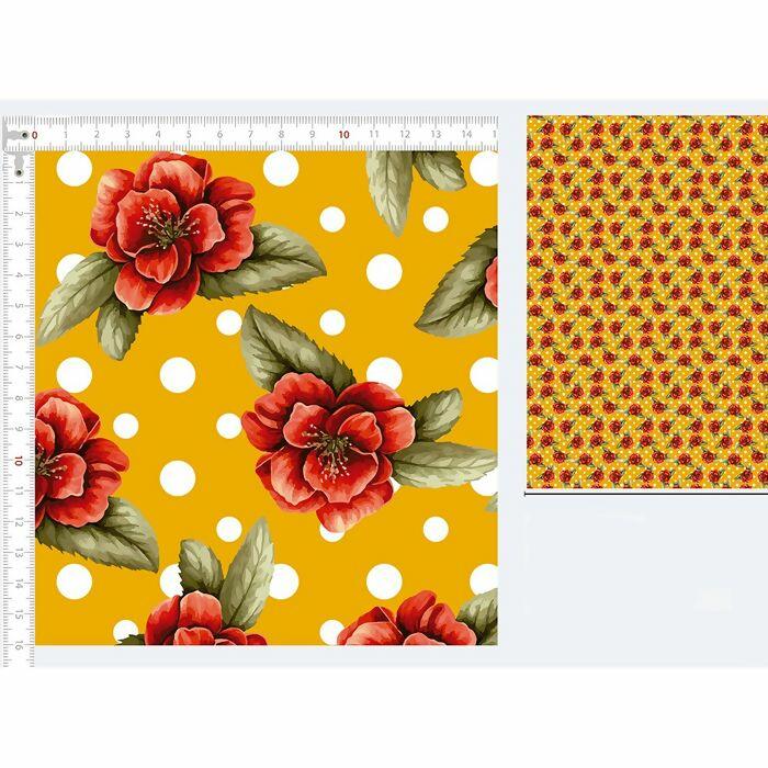 Descrição Tecido Tricoline Junino Flor e Poá Fundo Mostarda