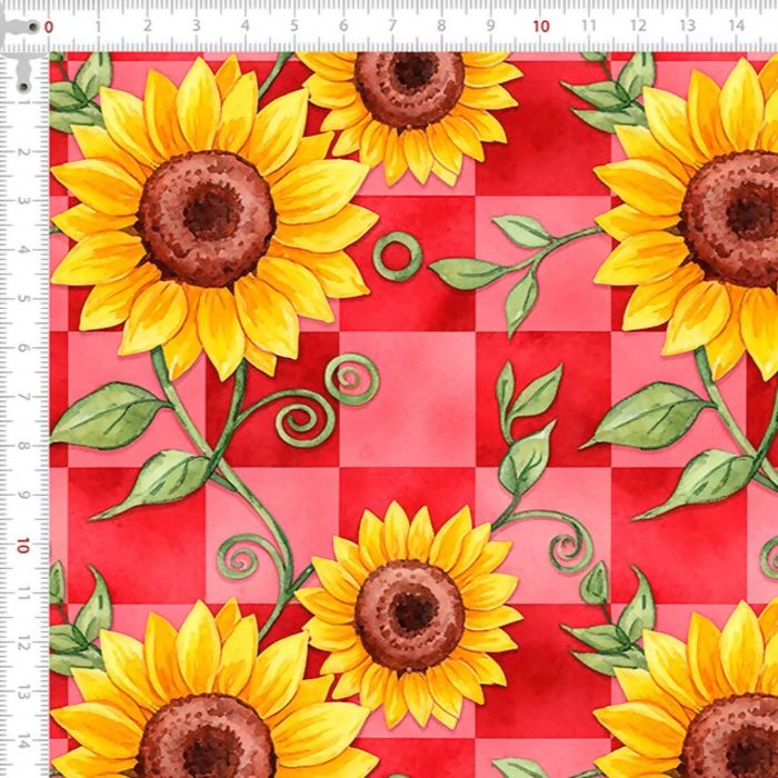 Descrição Tecido Tricoline Junino Girassol Quadrados Vermelhos