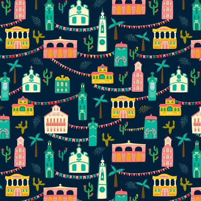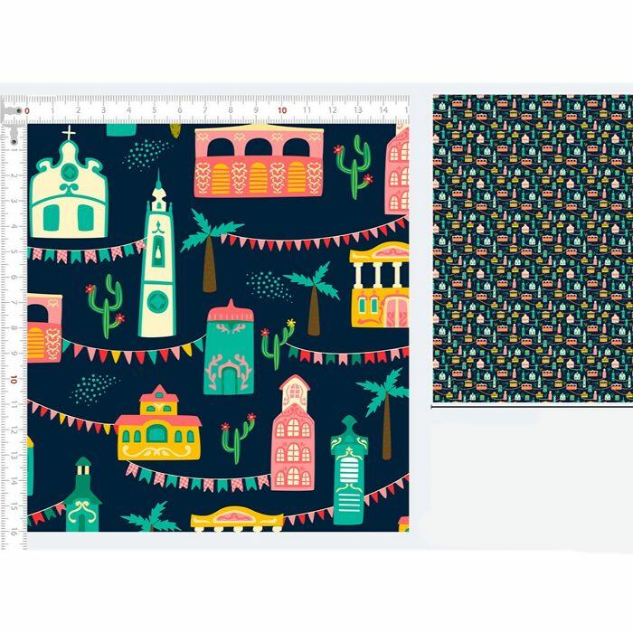 Descrição Tecido Tricoline Junino Prédios e Bandeiras Fundo Azul