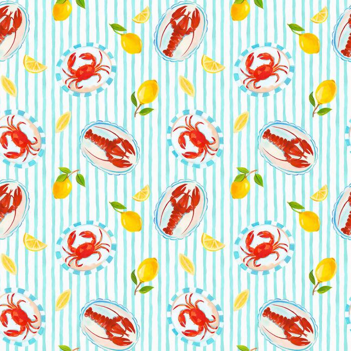 Descrição Tecido Tricoline Lagostas e Caranguejos Fundo Listrado